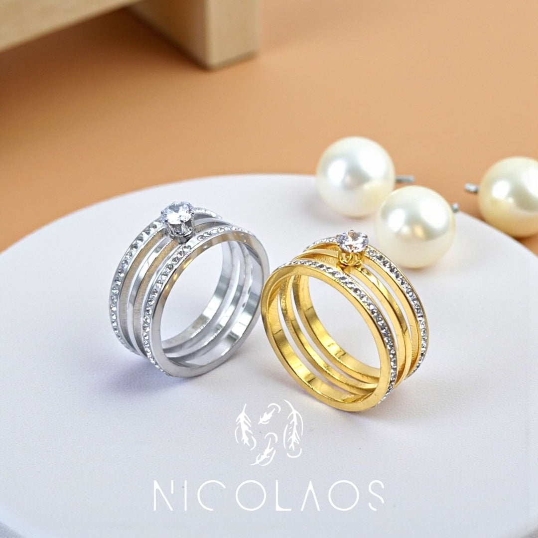 Δαχτυλίδι 'Crown' τρίσειρο από ανοξείδωτο ατσάλι με λευκά ζιργκόν