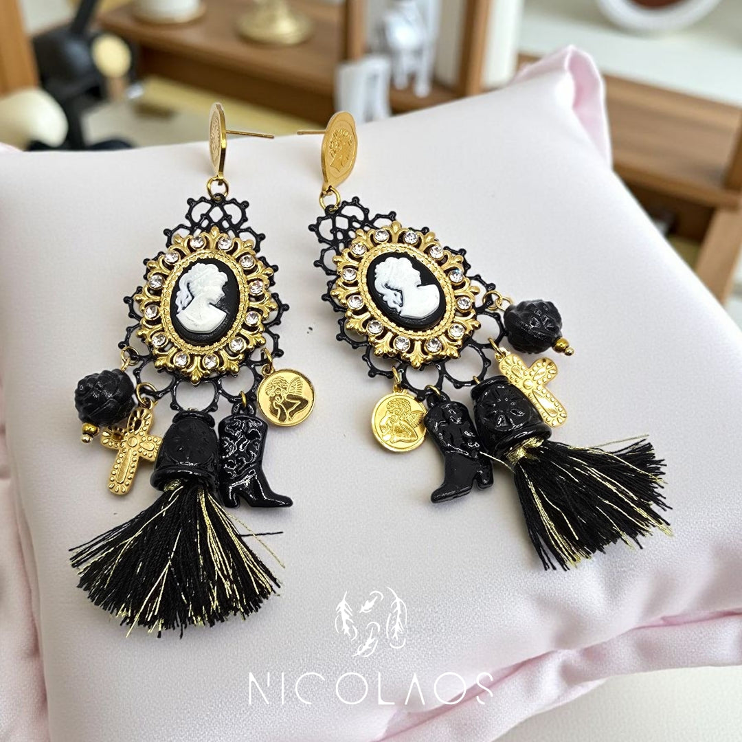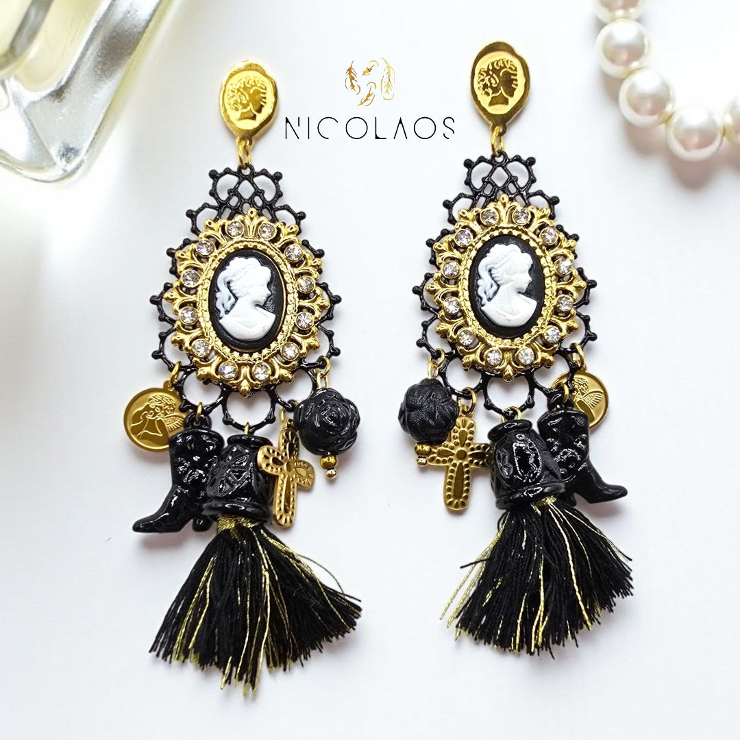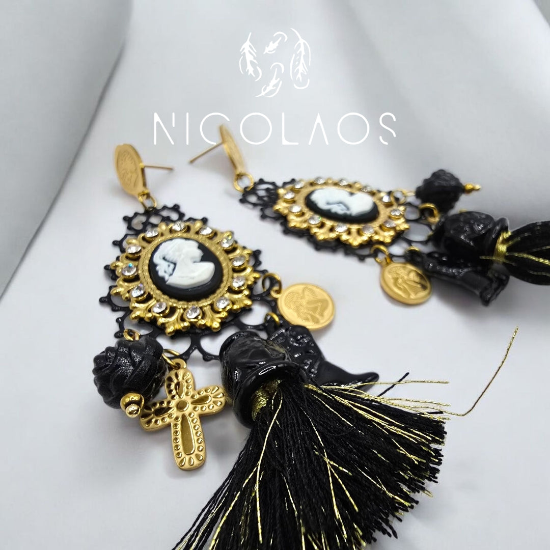 Χειροποίητα μακριά σκουλαρίκια 'Lady Bold' απο ανοξείδωτο ατσάλι με ανάγλυφο καμέο
