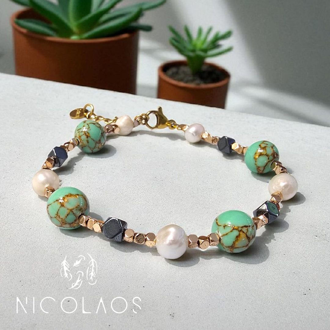 Χειροποίητο βραχιόλι 'Tibetan' με Θιβετιανό τυρκουαζ και λίθους Αιματίτη
