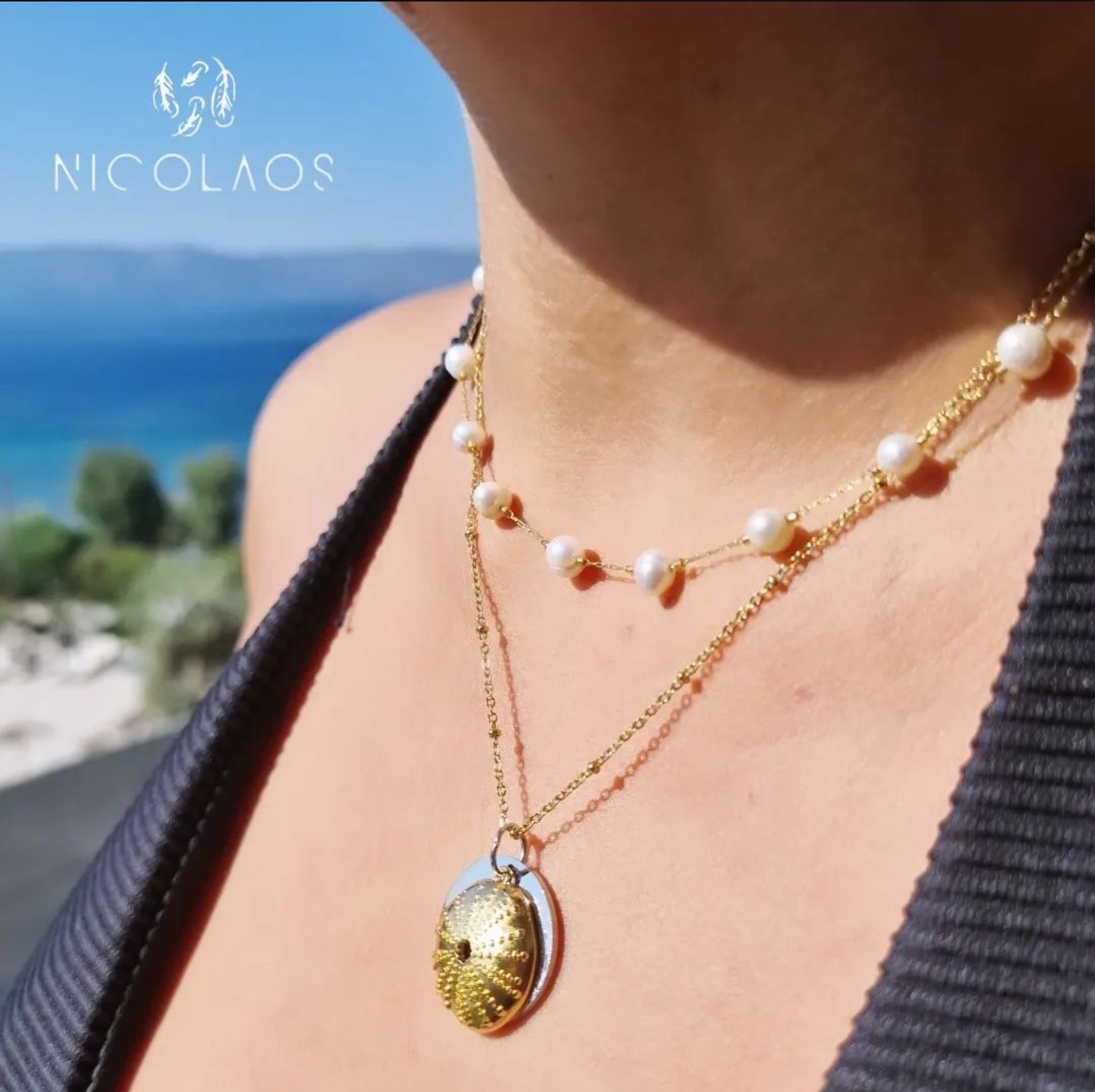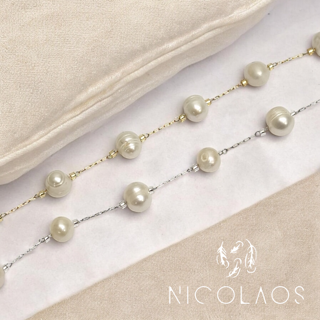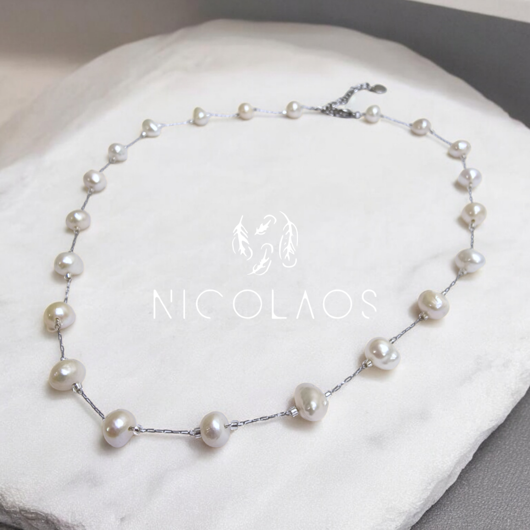 Χειροποίητο κολιέ 'Sicily' από ανοξείδωτο ατσάλι με λευκά πραγματικά ακατέργαστα μαργαριτάρια ποικιλίας Baroque